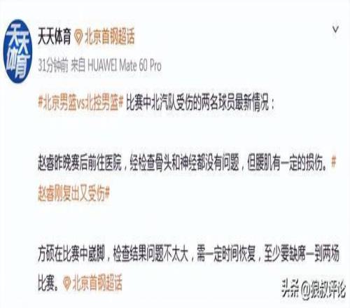 方硕在比赛中崴脚,检查结果问题不太大,需一定时间恢复,至少要缺席一到两场比赛。