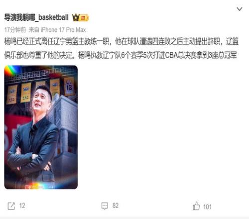 俱乐部宣布杨鸣辞去辽宁男篮主教练,此前球队遭遇四连败,排名滑落至第13位,辽宁省篮协工作人员:他目前还是协会法定代表人