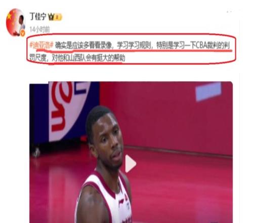 CBA裁判专家丁佳宁,给山西队外援迪亚洛提了一个建议,希望他能够好好学习一下CBA的规则,学习一下裁判的判罚。这样做,对他和山西队都是有巨大的好处。