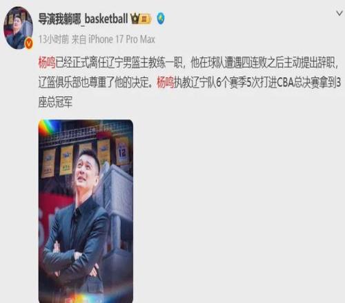俱乐部宣布杨鸣辞去辽宁男篮主教练,此前球队遭遇四连败,排名滑落至第13位,辽宁省篮协工作人员:他目前还是协会法定代表人