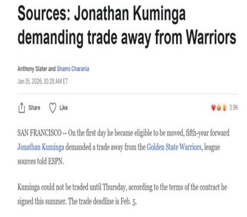 名记Shams在库明加获得交易资格第一天就曝出其团队已经向勇士提出交易申请,勇士也一直积极为其寻找下家。