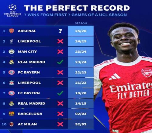 北京时间1月23日,在阿森纳以7战全胜的傲人成绩领跑本赛季欧冠联赛阶段的积分榜之后,来自德转的统计指出,枪手是欧冠历史上第10支取得开季7连胜的球队。