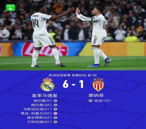 欧冠联赛阶段第7轮,摩纳哥客场1-6不敌皇家马德里,遭遇队史欧战最大分差失利。此役客场对阵皇家马德里,上半场0-...